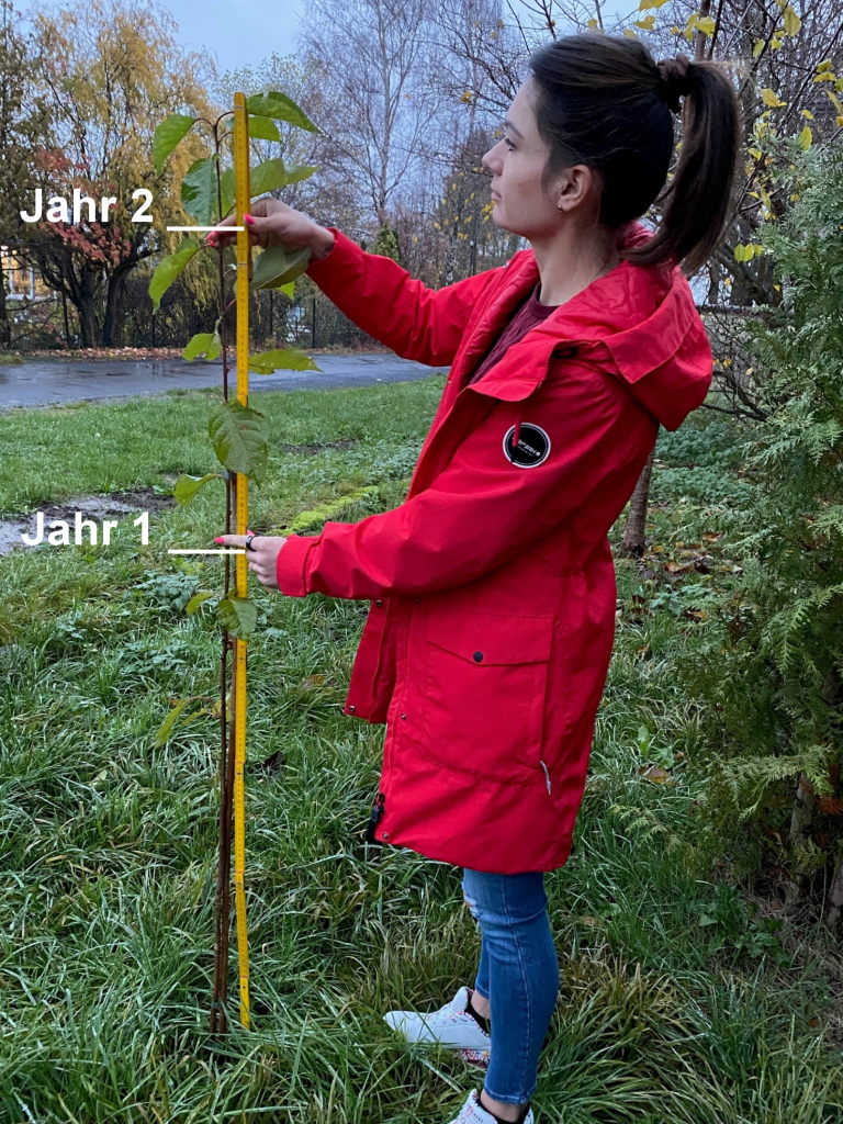 Im Frühjahr 2025 wurde unsere Royal-Avium Vogelkirsche erneut vermessen (gepflanzt 2024). Frau Christin Müller markiert den beachtlichen Größenzuwachs innerhalb eines Jahres. (Ort: Baumschulen Oberdorla, Hauptgebäude)